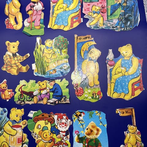 Sælger her et ark glansbilleder med sjove motiver af bamser.