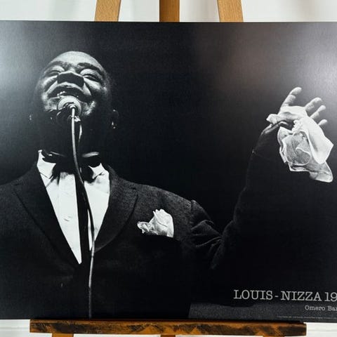 Maleri viser en portræt af Louis Armstrong der spiller trompet. Maleriet har en farverig og ekspressiv stil med fokus på ansigtets detaljer og instrumentet.