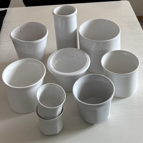 Hvide urtepotteskjulere med blomster.