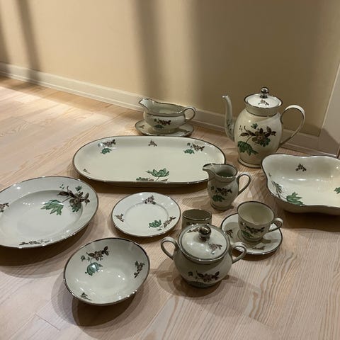 Samling dele til Grøn Vallø Platin stellet fra Københavns Porcelæns Maleri.