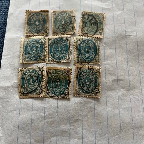 Ca 450 stk. frimærker med øreværdi. Desuden nogle få med et julemærke på. Desuden 1 stk firblok blå stemplet. 27 stk grønne 4 øres. Der er 10 ældre gamle frimærker.