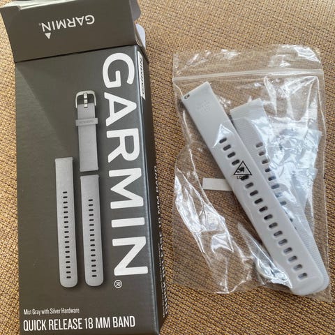 Uåbnet limestone læderrem fra Garmin inklusiv oplader til ur. Samt en gummirem