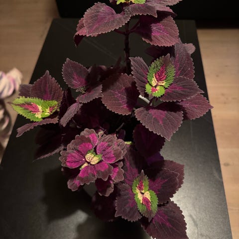 Coleus plante til indendørs brug med røde og grønne blade. Planten har farverige, mønstrede blade og er egnet til dekoration i hjemmet eller kontormiljøer.