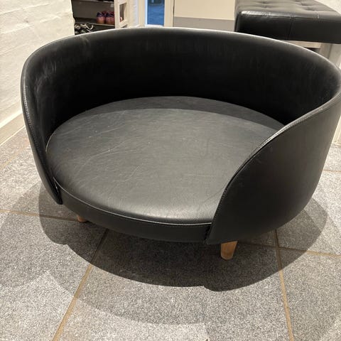 Hundeseng i læder look, brugt få gange . Sort , passer til hund op til 25 /30 kg.