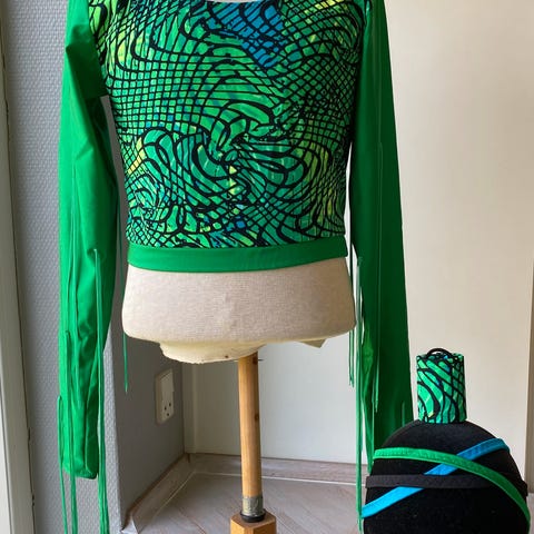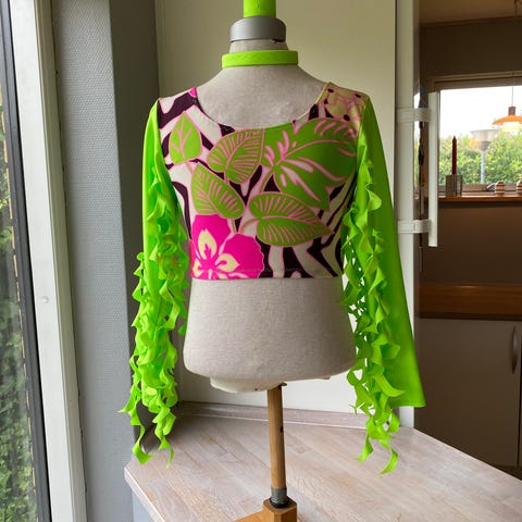 Discodragt, helt ny top i lycra uden glimmer fra www.discodragter.dk, str. 10-12 år ca. Leopard forstykke, sort ryg og laksefarvede (Salmon) ærmer med tynde frynser. Der følger hårtårn, 3 hårbånd og halsbånd med. Sæt selv leggings til.