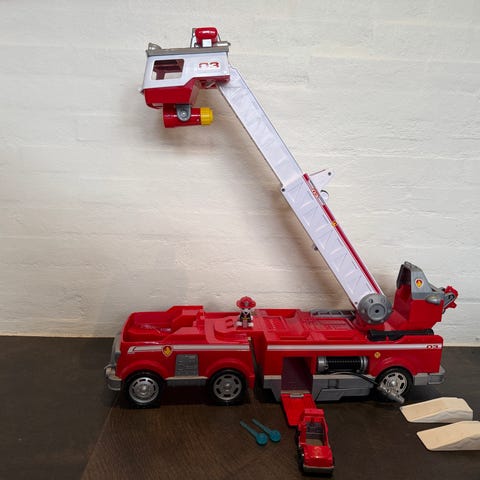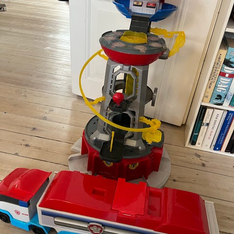 Paw Patrol Brandstation legetøjssæt med tilhørende brandbil og figurer. Brandstationen har en rutsjebane og flere etager, der kan bruges til rolleleg. Brandbilen er rød med en udtrækkelig stige og hjul til bevægelse. Sættet er lavet af plastik og er designet til børn.