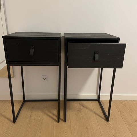 Vi sælger disse to pæne sengeborde fra Muuto. Der er Muuto Stacked i hvid med bagbeklædning. De fremstår pæne med få brugsspor. Kan benyttes som en del af stacked reolserien også. Ophæng medfølger.