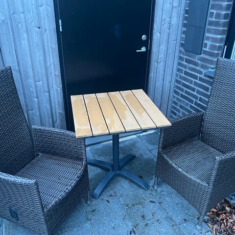 Udendørs bord og stole sæt med blå hynder