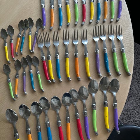 5 bordknive 23 cm, 2 gafler 19,5 cm, 3 kagegafler 16 cm