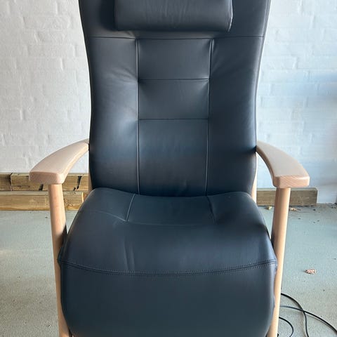 Sort læder hvilestol med høj ryg og polstret sæde samt armlæn. Stolen har indbygget elektrisk betjent fodstøtte og elektrisk betjent ryg- og lændestøtte, som kan justeres for øget komfort. Designet til brug i hjemmet eller kontormiljøer, hvor afslapning og komfort er ønsket. Materialet er sort læder, og stolen er monteret på et stabilt stel. Som ny. Næsten ikke brugt. Nypris 13.500kr