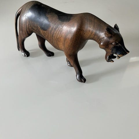 Træskulptur af en jæger med et rådyr båret over skuldrene. Skulpturen er lavet i træ og måler cirka 28 cm i højden. På undersiden er der indskrevet "Merano Italien 1954". Skulpturen viser detaljeret håndværk og kan bruges som dekorativ genstand.