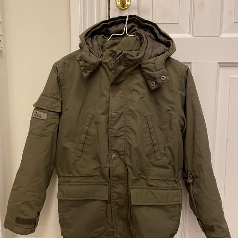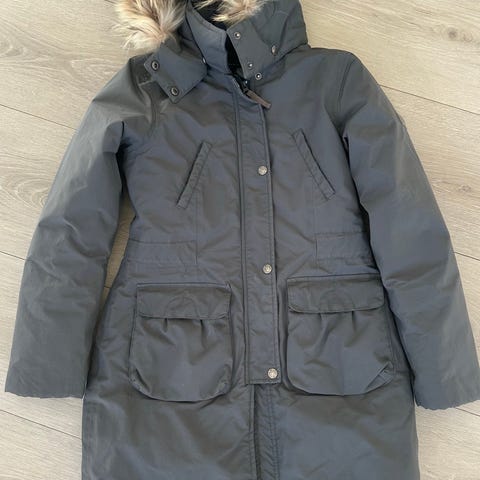 Sød og Lækker Ver de Terre dunfrakke i meleret grå med et flot uld-look. Vinterjakken har en hætte med en flot kant af pels. Vand- og vindtæt. Jakken er str 8 år. Den er er i rigtig fin stand. Ingen huller eller slid.