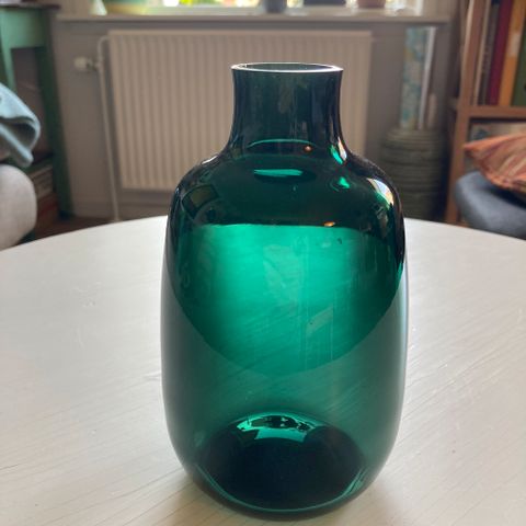 Rigtig flot mørke grøn kraftig glas vase/skjuler med lodrette riller rundt om hele vasen. H: 15 cm Ø 15 cm