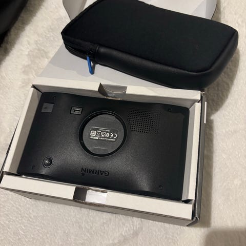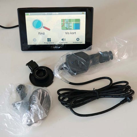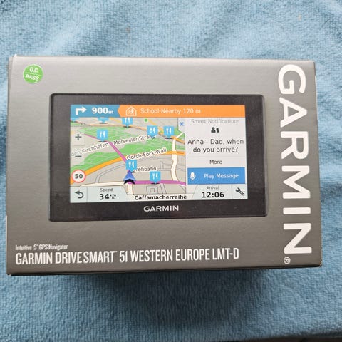 Garmin DriveSmart 61 Western Europe LMT-S GPS navigation enhed med farveskærm, stemmevejledning og opdaterede kort over Vesteuropa. Enheden inkluderer funktioner som trafikopdateringer, hastighedsgrænsevisning og forbindelse til smartphone for beskeder. Leveres med oplader og monteringsudstyr.
