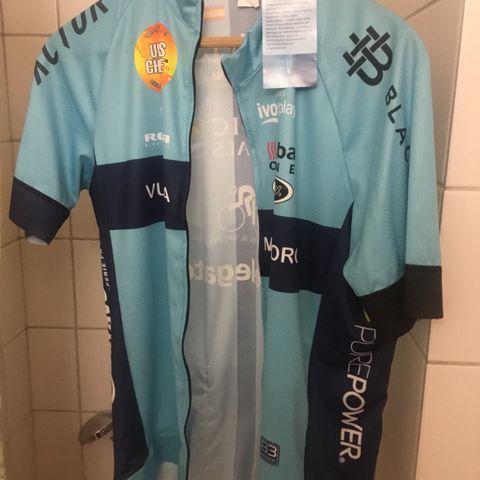 Astral cykeltrøje i størrelse L. Trøjen har en farvekombination af blå, rød og sort. Den er fremstillet i åndbart materiale og er designet til cykling med kort lynlås foran og elastiske kanter ved ærmerne. Trøjen har lommer på ryggen til opbevaring af små genstande under cykelture.