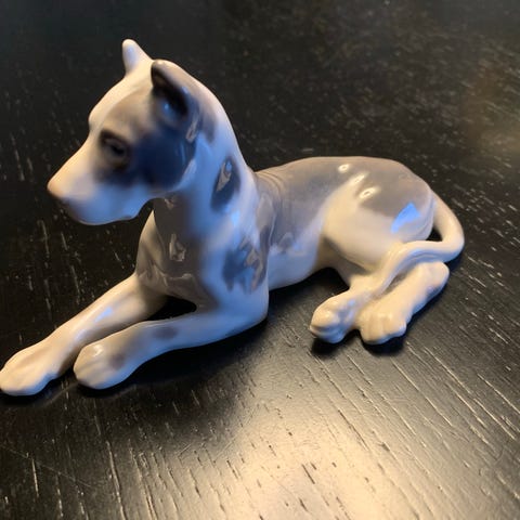 B&G 2190 porcelænsfigur af en liggende hund i grå og hvid farve. Figuren er lavet af porcelæn og har detaljeret håndmaling. Velegnet som dekorativ genstand.