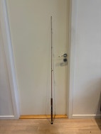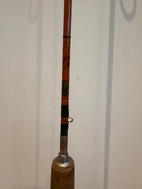 Klassisk dansk spinnestang fra 60/70’erne i glasfiber med korkgreb og metalbeslag.