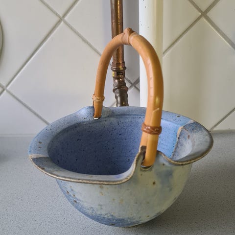Den er lavet af naturmateriale af en art - jeg ved ikke om det er bambus. Har aldrig været brugt.