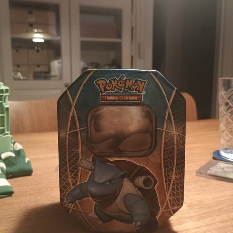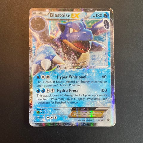 Pokémon Blastoise EX samlekort med holografisk finish. Kortet viser Blastoise i en dynamisk kampstilling og indeholder information om angreb og evner. Kortet er egnet til samling og spil i Pokémon Trading Card Game.