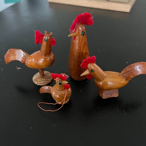 Mariehøne, Træ, 7 ting bestående af 2 sparebøsser, 2 ophæng hvoraf den ene er med en fjeder, mariehøne til at massere med, en mariehøne pige med bevægelige dele og en mariehøne til huskesedler. Massage dimsen solgt.