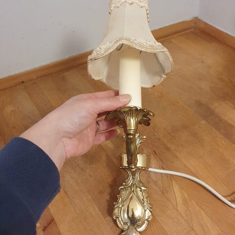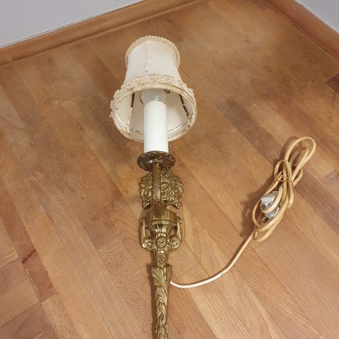 Jysk væglampe med beige lampeskærm og arm i messing. Lampen er designet til vægmontering og har et klassisk udseende. Passer til forskellige indretninger og kan anvendes som læselampe eller stemningsbelysning. Højde 36 cm, dybde ud fra væg er 37 cm.