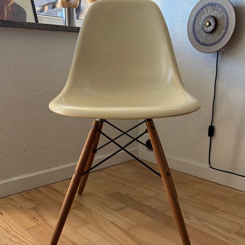 Eames, Side chair, Stol, Eames Side Chair. Herman Miller Collection fra Vitra. I god stand generelt både hvad angår stel, glasfiber og shock mounts. Betrækket har dog løsnet sig lidt.