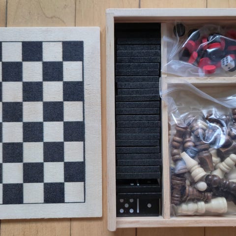 5 forskellige spil med brikker og spillebræt lavet af træ.