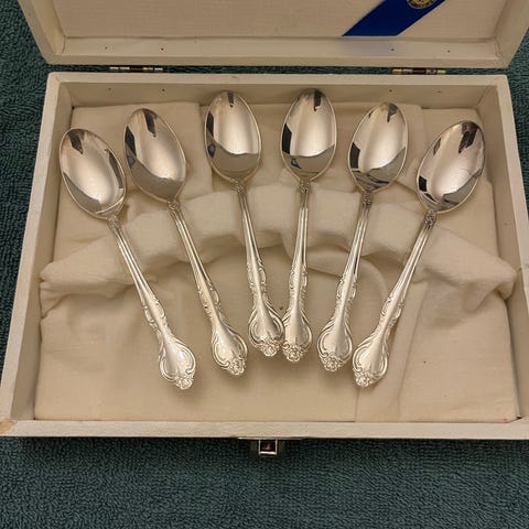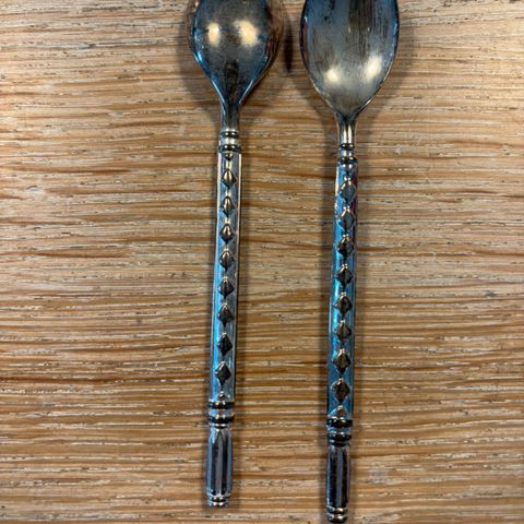 Sæt bestående af 4 kaffeskeer i sølvplet. Skeerne har et dekorativt mønster på skaftet, trænger kraftigt t pudsning.