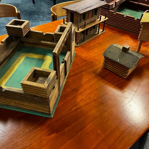Western-Style Saloon træmodel legetøj, lavet af træ med detaljer som bar og saloon facade. Modellen har grønne vinduer og en balkon med gelænder. Leveres i original æske med western-tema illustrationer. Velegnet til samling eller som dekorativ genstand.