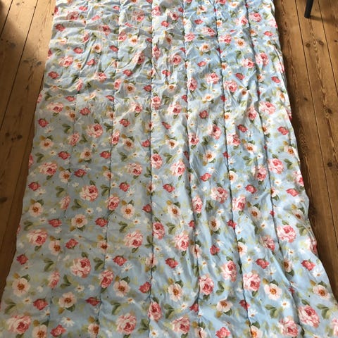 Vintage vattæppe i god og tyk kvalitet. Blomstret og stribet 100 % bomuld. Smukke roser! Vattæppet er tykt og vamset.
