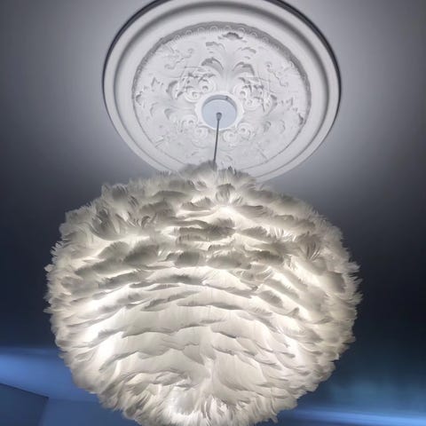 Hver fjer er omhyggeligt udvalgt og nænsomt fastgjort for at forme lampens bløde, luftige silhuet – som en sky, der svæver roligt gennem rummet. Det naturlige fjerlag filtrerer lyset på smukkeste vis og skaber et stemningsfuldt og organisk lysspil.