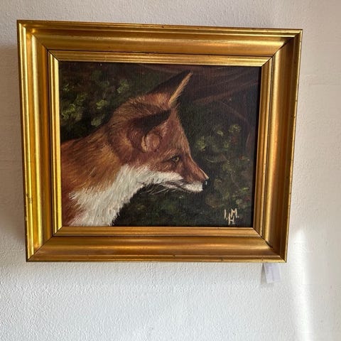 Maleri forestillende en skov i efterårssæsonen med træer i orange og gule nuancer. Motivet inkluderer flere hjorte i forgrunden. Maleriet er indrammet i en brun træramme. Ring gerne med et bud 41953115