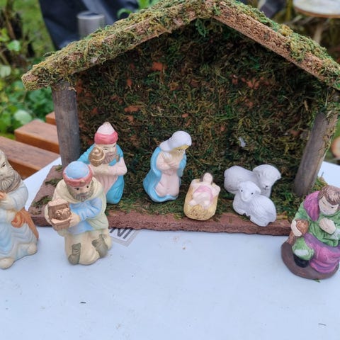 Skøn julekrybbe. Længde 25 cm, højde 16 cm (hvor den er højest). Alle figurer er med sølvglimmer og er fastmonteret i hytten.