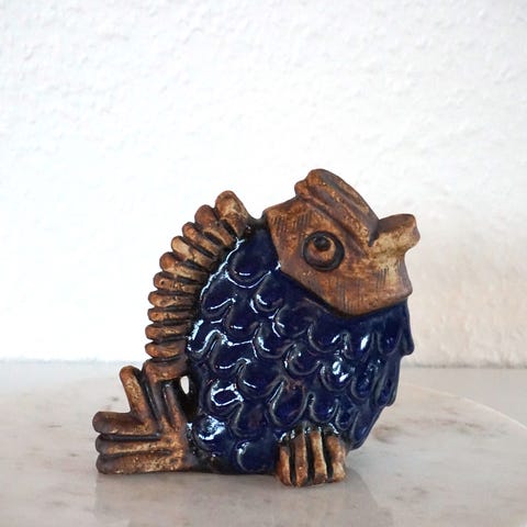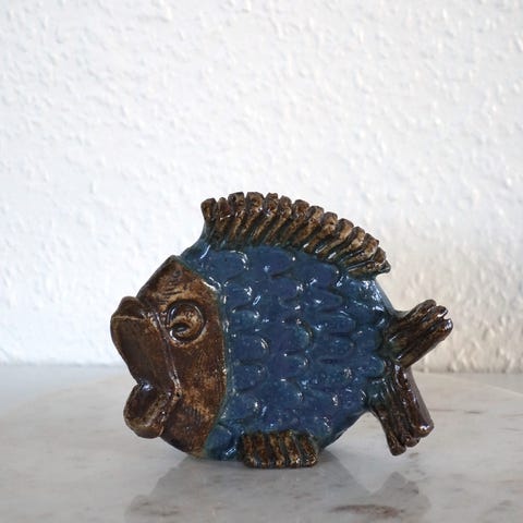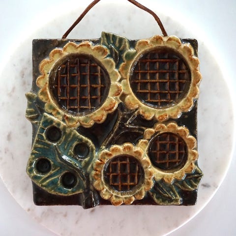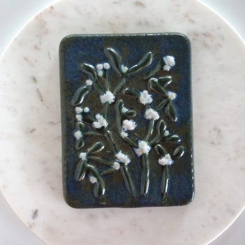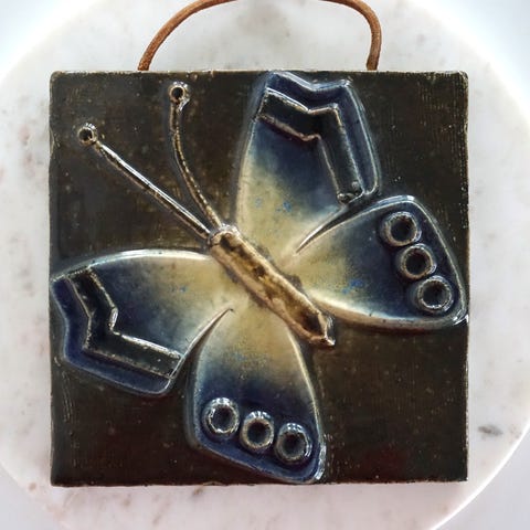Fin keramik relief / vægplade / vægdekoration fra svenske EGO Stengods (1966-1988). Designer Willi Fischer. Motivet er lyng på blå baggrund. Glaseret.