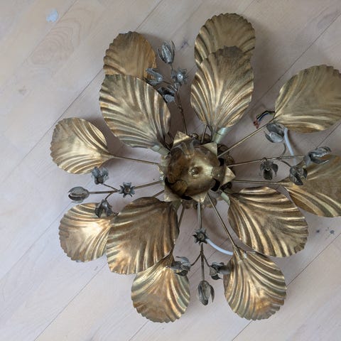Smuk italiensk loftlampe af malet metal, dekoreret med liljer og blade. Der er seks lyskilder.