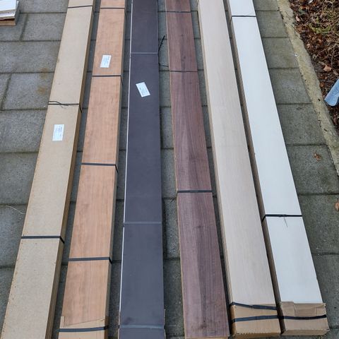 16,6 cm høje sokker i eg- kirsebær- hvid- grå i forskellige længder, de fleste i 125cm og dybde 50,5 cm. De er med ende afslutninger, men har også løse. Ps! Har tilsætninger og lyslister med beslag.