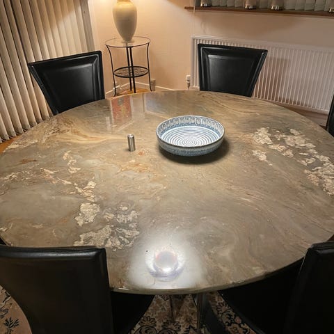 Rundt marmor spisebord, brugt med beskyttelse siden den blev købt, så ingen pletter eller ridser på marmorpladen. Brugsspor på metalpladen.