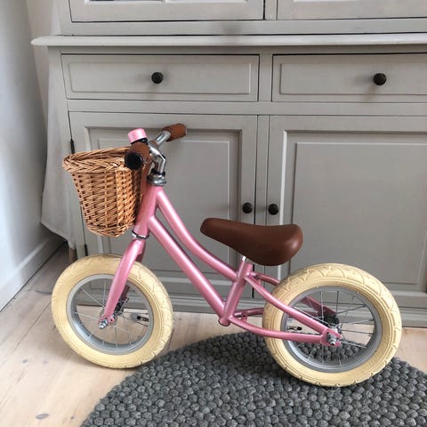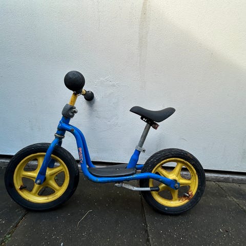 Stoy grå løbecykel. Har en smule rust på styr og et enkelt mindre hak i sadel men ellers i fin stand.