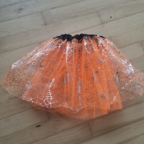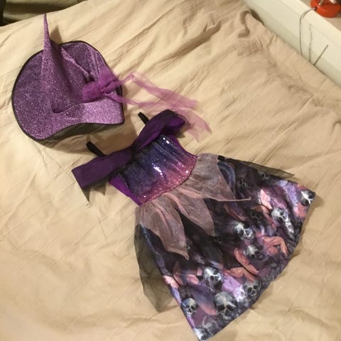 Halloween kostume str. 128-140, bestående af en kjole og hat. Kjolen har lange ærmer i lilla og en nederdel med sort og orange zigzag-mønster. Forsiden af kjolen er dekoreret med halloween-motiver som edderkop, spindelvæv og kat. Brugt et par gange, men der er til mange timers leg og udklædning i dette sæt endnu 😊