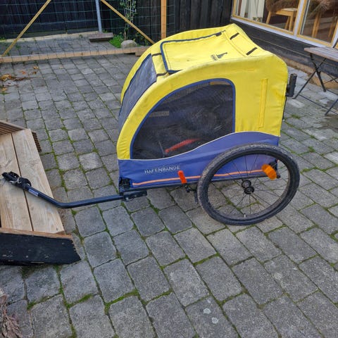 Er meget nem at køre med - også i ujævnt terræn. Kan både bruges som klapvogn og spændes på cyklen, så hunden der ikke længere er godt gående også kan komme med på tur. Har altid stået inde.