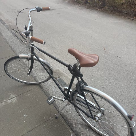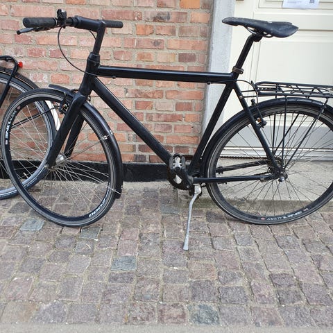 Bemærk: Den venstre pedalarm (krankarmen) sidder lidt løst. Den trænger til at blive spændt godt efter, eller evt. udskiftes, hvis gevindet er slidt. Det er et velkendt og nemt fiks. Cyklen kører ellers upåklageligt.