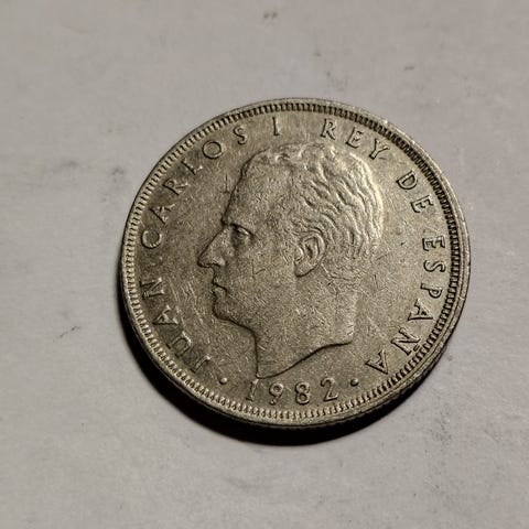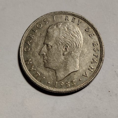 Juan Carlos I 1 Peseta mønt fra 1985. Den viser portrættet af Juan Carlos I på forsiden og værdien '1 Peseta' med et våbenskjold på bagsiden.