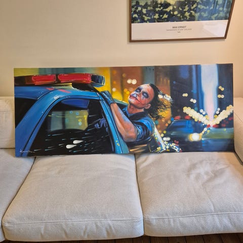 Kunstnerisk tryk af halv joker og halv batman. Inspireret af The Dark Knigt universet.