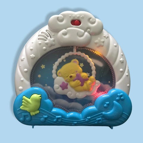 Denne er beroligende. den lyder som rislende vand, susen og regnlyde samtidig har den en beroligende melodi. Den har 4 forskellige melodier. Den har også lys som kan indstilles til 10 minutter roligt natlys. Hvis baby vågner og græder aktiver den lyd og lys igen.