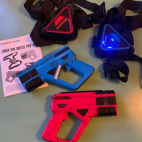 Vapor blaster. 2 player pack. Det er en laser tag. Den kan skyde +61 meter. Man skal tilføje vand.