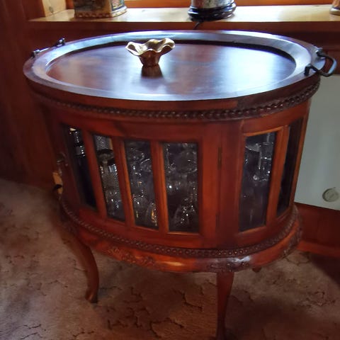 Vintage bar disk fremstillet i træ med glasoverflade. Baren har en vinklet form og giver plads til opbevaring på bagsiden. Velegnet til brug i hjemmet eller i mindre barområder.