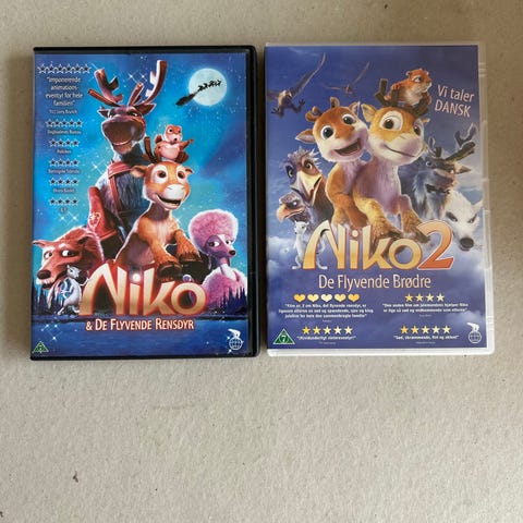 Niko 1 og 2 DVD sæt med børnefilm på dansk. Indeholder filmene 'Niko - De Flyvende Rensdyr' og 'Niko 2 - De Flyvende brødre '. DVD'erne er i standard format og egnet til børn.