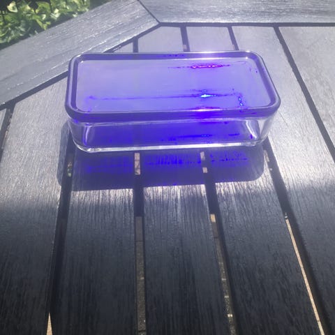 Dette er en gennemsigtig glaskrukke med låg. Det har en diameteren på 11,5 cm og en længde på 17,5 cm. Krukken ser ud til at have en tætning i låget, som sikrer indholdet. Glaset er formet næsten cylinderformet med glat overflade. Både toppen og bunden har prægede symboler og figurer.