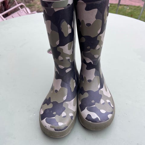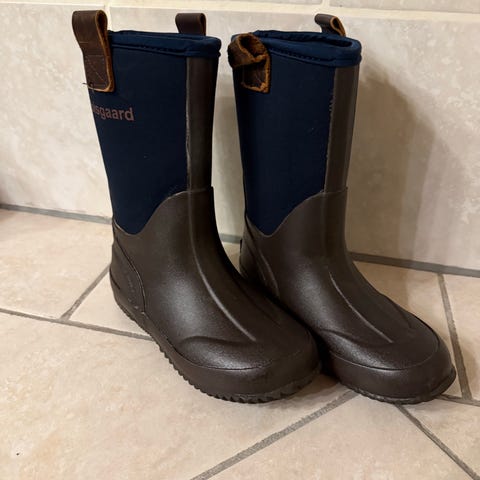 Bisgaard børnestøvler i størrelse 37 til unisex. Støvlerne er fremstillet i brunt gummi og har en slidstærk sål med mønster for bedre greb. Der er et mindre hul på den ene støvle, som ses på billedet. Støvlerne er velegnede til udendørs brug i vådt vejr.