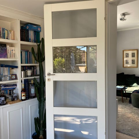 Kvalitetsdør med ramme af massivt træ. Ruderne er med sikkerhedsglas. (Uden håndtag)